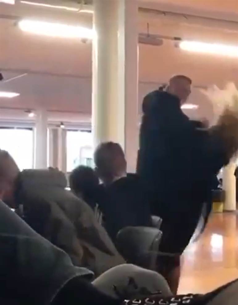 Same place. Same argument. But this time you could actually see what the viral caption glossed over: the man yanks the chair out of her hands first. Not a gentle “my bad.” A hard, possessive pull—like he’s trying to prove a point.