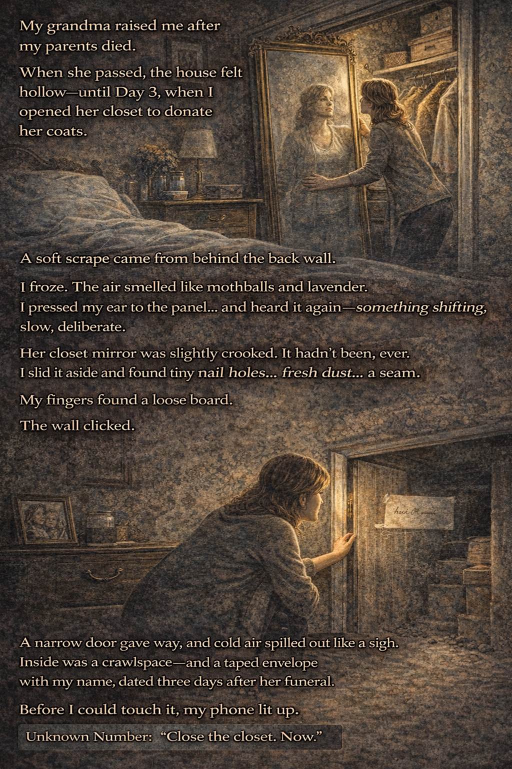 I stood there holding a coat like it could keep me steady, then pressed my ear to the panel and heard it again—slow, deliberate, not a house creak, not a pipe.