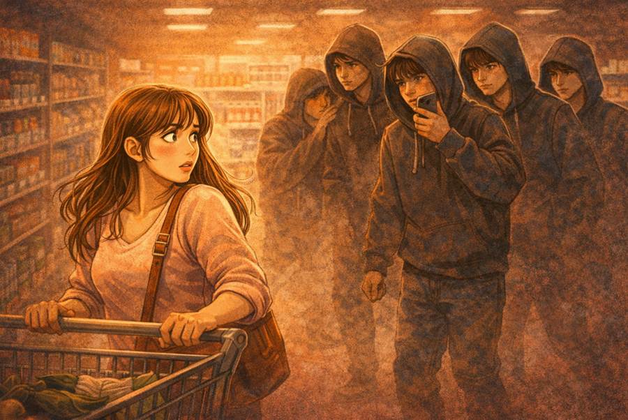 I went to Walmart for milk, detergent, and socks, thinking only about getting in and out. Halfway through the first aisle, I noticed five teen boys drifting behind me—hoods up, whispering, not holding a single item. I told myself I was being paranoid, but every time I turned, they turned; every time I stopped, they stopped. My hands got slick on the cart handle, and the store suddenly felt too big and too loud.